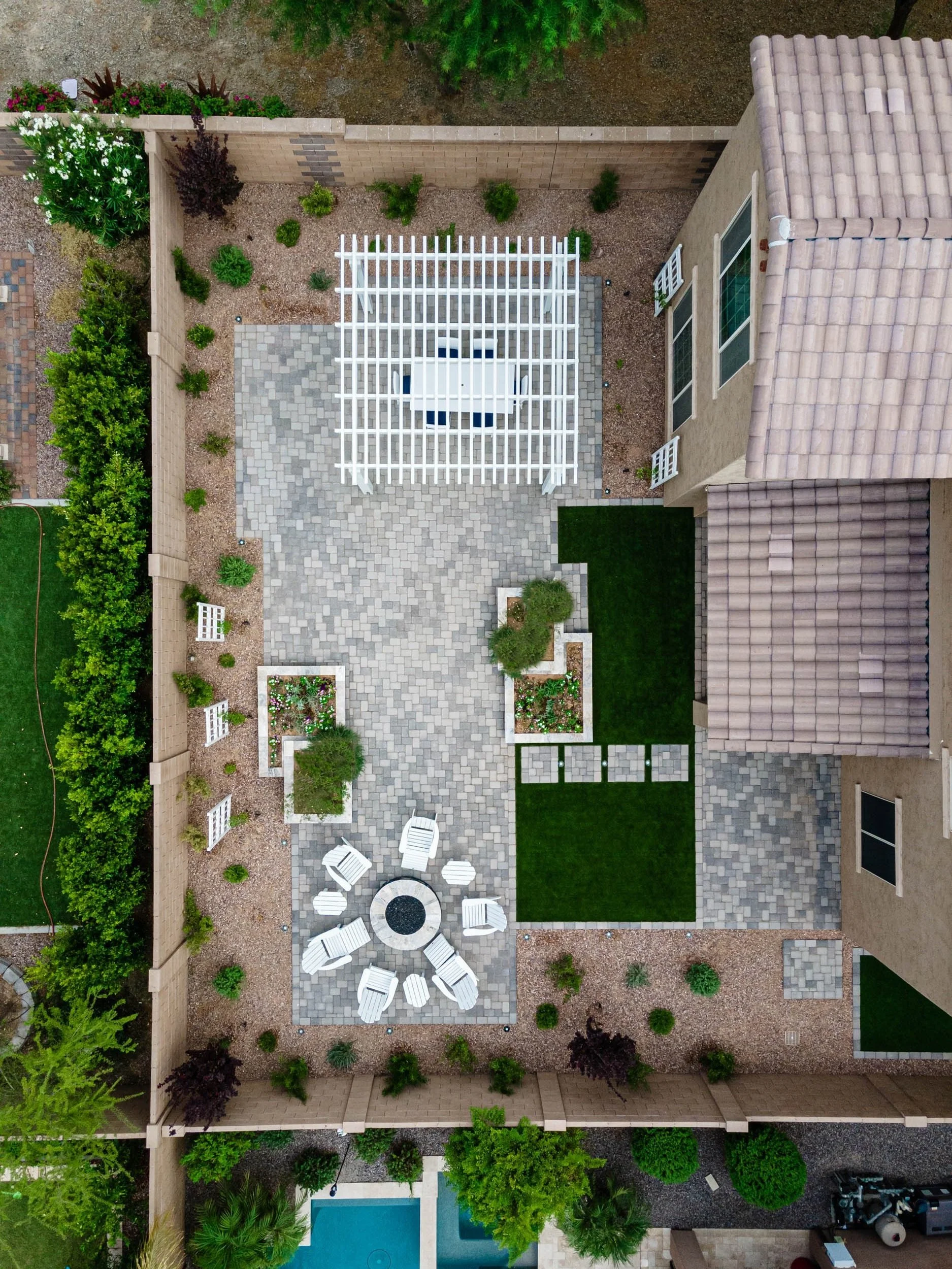 This cozy Gilbert backyard is all about the details, using a 6”x9” Belgard Catalina Concrete Paver that is laid in a herringbone pattern. Well-placed ground lighting surrounds and frames the hardscape layout. A shade structure provides a great area for outdoor dining, and the stone fireplace provides a warm area to gather around in the cooler months.